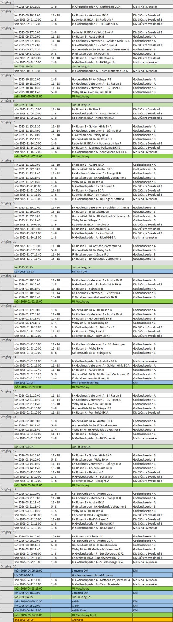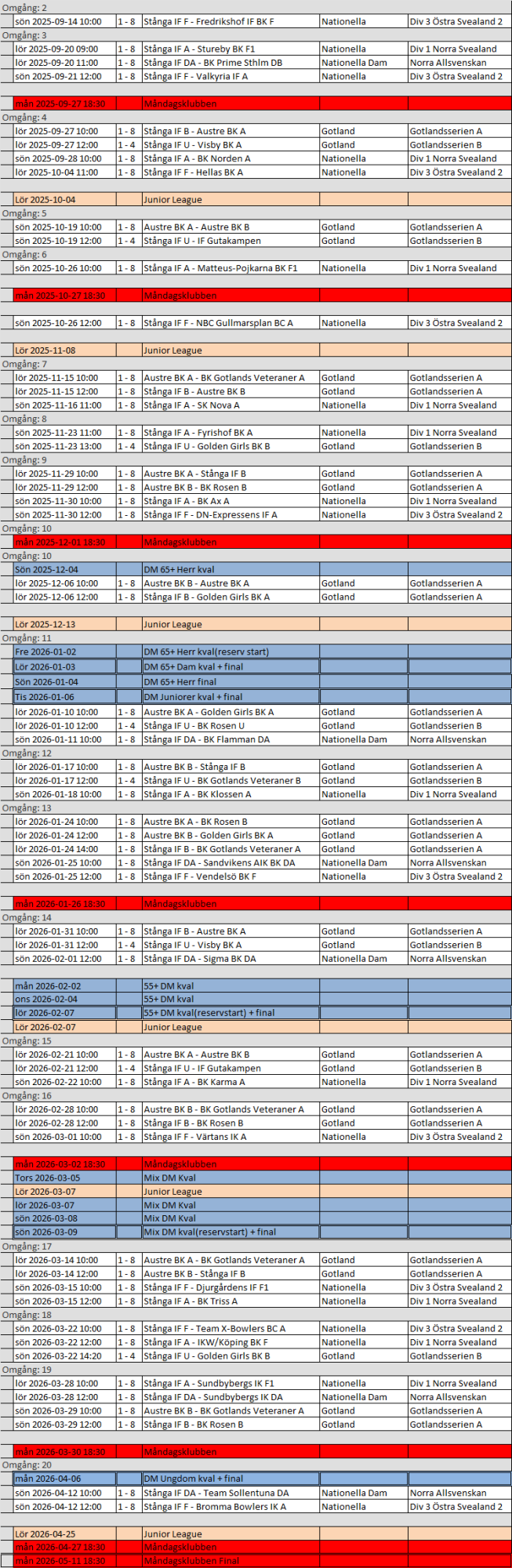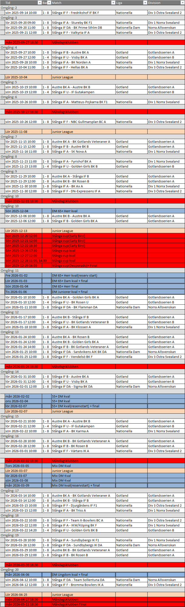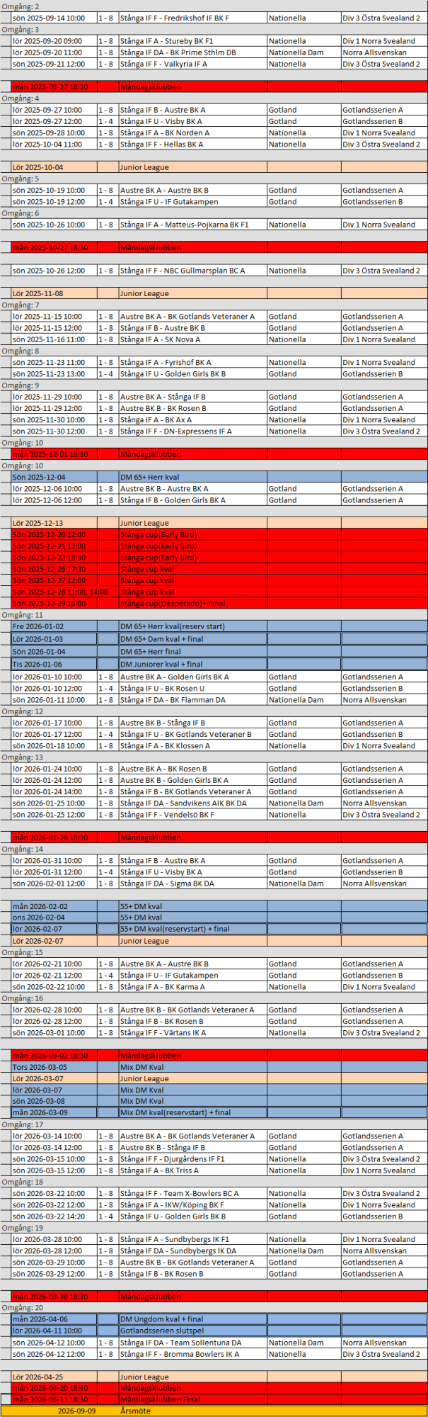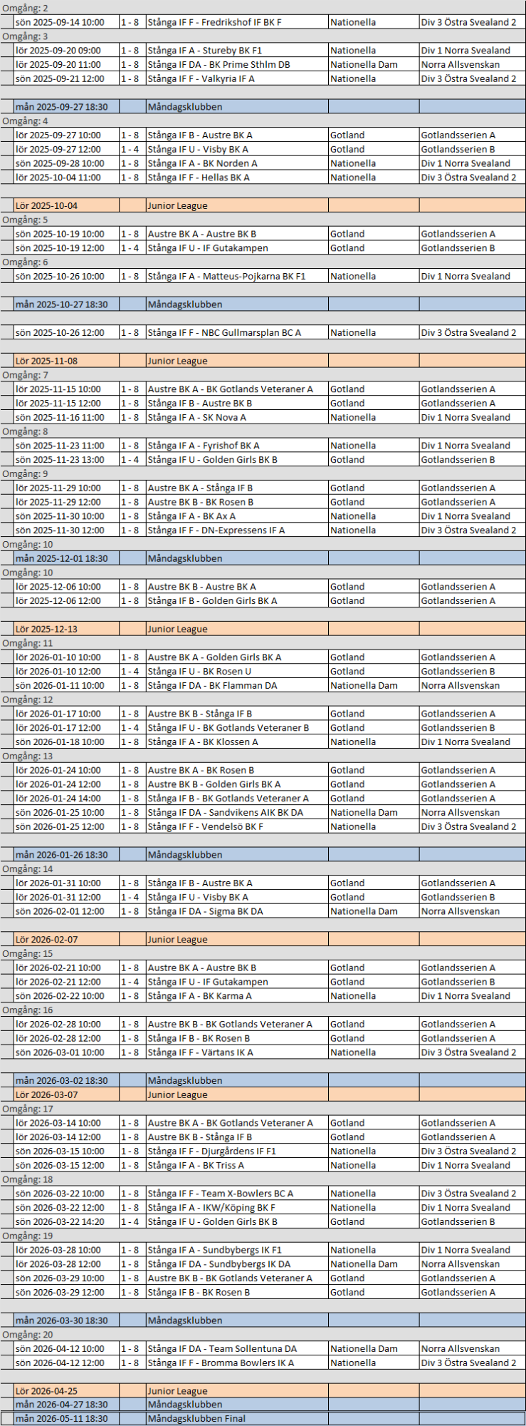 Tävlingsschema för Stånga bowlinghall