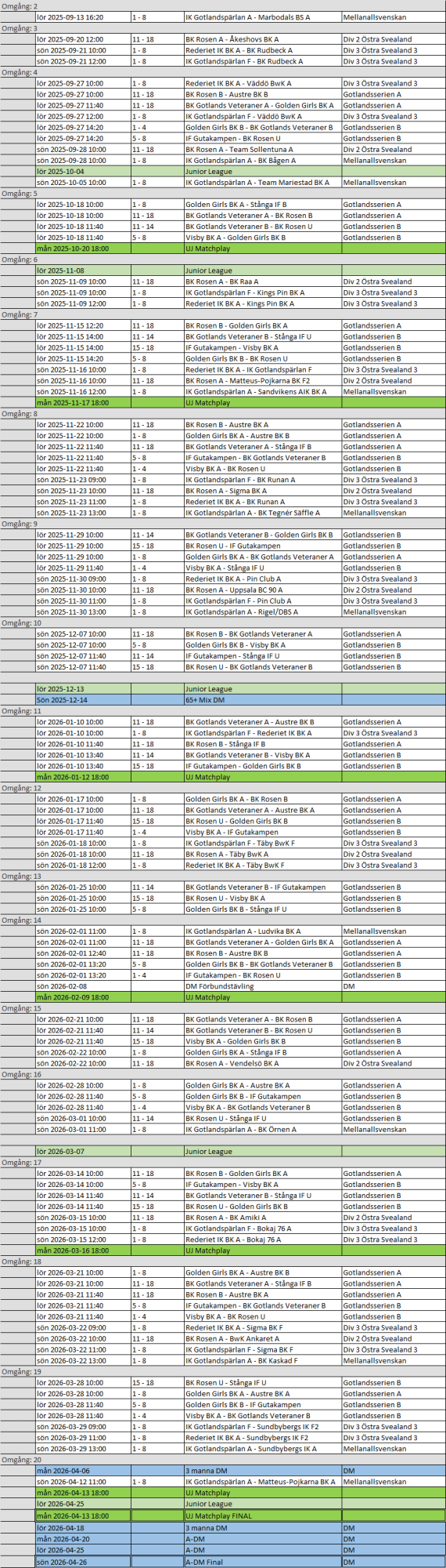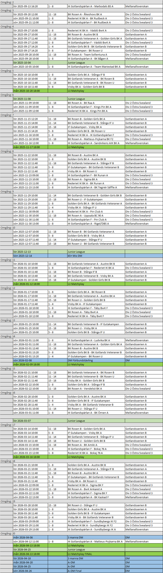Spelschemat kommer att uppdateras efterhand som nya tävlingar och matcher blir tillgängliga.